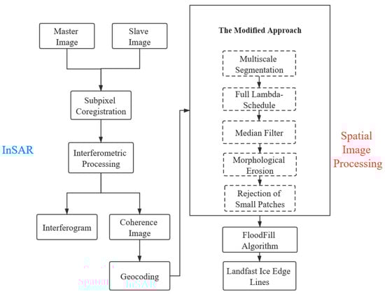 In this paper, an interferometric image pair is constructed by two Sentinel-1 SAR images (the one with an earlier acquisition time, used as a geometric reference, will be called the “master image” and the other the “slave image”) from different acquisition times. The SNAP software is used for processing the satellite SAR data to generate and geocode the coherence image. Then, the coherence image is geocoded to transfer the SAR image coordinate system to the geographic coordinate system (WGS_1984_UTM_Zone_34N) for subsequent processing. Over the geocoded coherence image, the edge between landfast ice and drifting ice is extracted by the modified approach. Finally, the full landfast ice extent is obtained using floodfill algorithm.