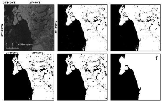 (a) The coherence image obtained from image pair 3; The process results after multiscale segmentation (b), median filtering (c), morphological erosion (d), rejection of small patches (e) and floodfill algorithm (f), respectively. The white area represents landfast ice, and the black area represents other ice.