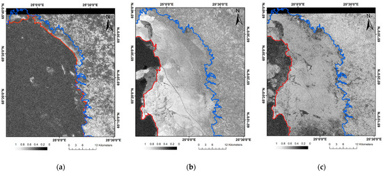 The extracted results by the reference method: (a) The seaward edge lines of landfast ice extracted by image pair 2; (b) The seaward edge lines of landfast ice extracted by image pair 3; (c) The seaward edge lines of landfast ice extracted by image pair 4. The blue line represents the land–water boundary extracted by modified approach and the red lines represent seaward edge lines of landfast ice.