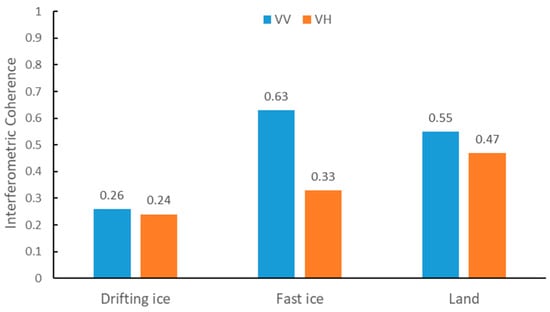 The coherence value indicates the stability and correlation of the land features between two acquisitions. The displacement and deformation of landfast ice are usually small owing to its stable ice body, so its coherence is relatively high. But for drifting ice or water, its coherence is relatively low due to the influences of strong winds and changing ocean currents. Ocean currents will constantly change the distribution of drifting ice and may break up its body with high energy [37]. Therefore, the difference between landfast ice and drifting ice in coherence provides an obvious discrimination (bright and dark) in coherence image.
