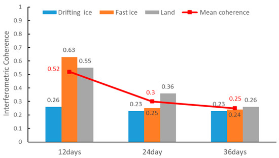 In InSAR technology, the temporal baseline of image pairs determines how long sea ice remains stationary before it can be classified as fast ice. To select the appropriate temporal baseline, image pairs with different temporal baselines are constructed in the study area, and then coherence statistics is performed. As shown in Figure 7, the overall mean coherence gradually decreases as the time interval of the temporal baseline increases. Under the temporal baseline of 12 days, the mean coherence values of fast ice and drifting ice are 0.63 and 0.26, respectively, and their difference is up to 0.37. When the temporal baseline is increased to 24 days and 36 days, the coherence difference between the fast ice and drifting ice is only 0.02 and 0.01, respectively, which can no longer meet the requirements of extracting landfast ice edge. The ice charts show that the thickness of sea ice increases from 10–30 cm to 40–55 cm within 36 days. Influenced by temporal de-coherence factors, severe de-coherence phenomenon can occur when sea ice changes significantly. In theory, the longer the temporal baseline is used, the more accurate the landfast ice extent is obtained. But the longer baseline also means an increased probability of de-coherence. It is the best solution to select the longest temporal baseline considering the available coherence images, so the temporal baseline in this paper is 12 days.