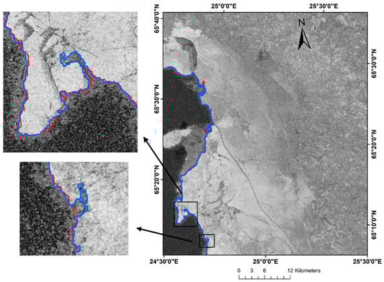 The edge extraction is usually aimed at the seaward landfast ice edge. For the landward edge, the existing coastline data is generally used to replace it. However, the coastline changes year by year in coastal areas severely eroded by fast ice [46]. Inaccurate results can be caused by using low-resolution or untimely updated coastline data. This study adds the work of extracting landward landfast ice edge and validates the performance of the modified approach. Sentinel-1A provides a large amount of available data given its high spatial resolution and temporal coverage. Thereby, Sentinel-1A data from the summer ice-free period of the observation year are used to construct the image pair. The difference in coherence between land and sea surface can be used to extract the land–water boundary as the landward edge of landfast ice through the same technical method.