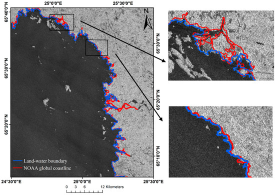 The land–water boundary extracted by image pair 1 is compared with the global coastline data released by NOAA to evaluate the performance of the method proposed in this study.