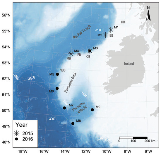 Acoustic data were collected along the edge of the continental shelf off western Ireland using Autonomous Multichannel Acoustic Recorders (AMARs; JASCO Applied Sciences) over four recording periods spanning from May 2015 to November 2016 (Table 1). The devices were suspended 15 m above the seafloor at four locations in 2015 (M1–M4) and six in 2016 (M3, M5-M9; Figure 1 and Table 1), at an average operating depth of approximately 1800 m.