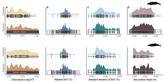 Observed values of oceanographic variables in the presence and absence of Cuvier’s (first row) and Sowerby’s (second row) beaked whale click detections: (a) chla concentration, (b) relative sea surface temperature (SST), (c) standard deviation of SST and (d) sea surface height. Each variable is shown at the most appropriate scale, as determined by the preliminary multi–scale approach (see Table 4).