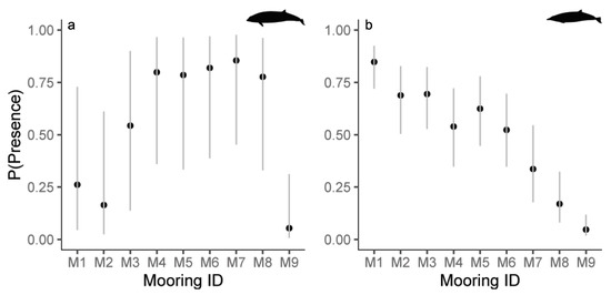 Probability of presence of (a) Cuvier’s and (b) Sowerby’s beaked whale clicks modelled as a function of the mooring ID. Shaded areas represent 95% confidence intervals.