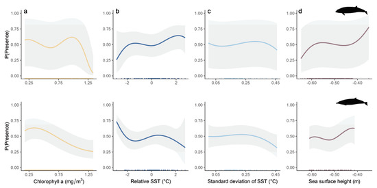 The sea surface height was significant and moderately important in models for both species. The probability of detection of both Cuvier’s and Sowerby’s beaked whales was minimal when the SSH was the most negative. In the North Atlantic, SSH is generally depressed (i.e., negative values), which can reflect cyclonic eddies, associated with high productivity due to the occurrence of upwelling events [79]. Relationships between SSH and beaked whale presence have been reported previously, suggesting an association between the presence of the whales and that of eddies and upwelling phenomena [74,80]. In particular, Correia et al. (2015) [74] found that peaks in the presence of beaked whales corresponded with either high negative or high positive anomalies. However in our study, only negative SSH values were observed, which makes comparisons difficult.
