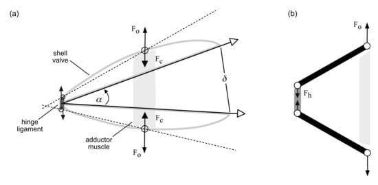 The basis of the model used in this study was described in a previous article ([30]; also see the summary in the Appendix A). It is the first biophysical model to represent processes involved explicitly in variations of the gape angle. Briefly, our model describes how the distance between the two valves, , changes as a function of the angle (called the gape angle, , in radians) formed by two rays placed on each valve (Figure 1). The origin is located at the umbo, and the plan formed by the two rays is perpendicular to the axis materialized by the hinge. When the gape angle , the shell is closed. The gape angle is used because this parameter is less sensitive to changes in specific protocols, such as where the sensors are placed on individual organisms, and with differences in the sizes of organisms used. Any changes in are explained in terms of the passive forces, due to the ligament action, and the active forces (opening force () and closing force ()) from the adductor muscle, which act to close the two valves. The adductor muscle(s) is anchored onto the shell interior some distance away from the valve edge and the hinge ligament. When the adductor muscle is active, it uses energy to shorten the muscle, pulling the valves closer. Closing the valves also means the muscle works against the elastic hinge ligament (stretching it). The valves open passively (the muscle relaxes and the hinge ligament returns to its shorter, unstretched state) with no additional energy input.