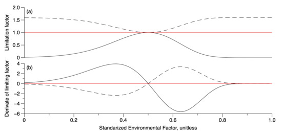 Generic functions describing the influence of the environmental variables on the biophysical model parameters. (a) Standardized limitation functions (solid line) and (dashed line) applied to a, r, and s, respectively. (b) The analytic derivation of the limitation functions shows the variation rates of the limitations of a and r (), solid lines) and the variation rates of the limitations of s (, dashed line) being an amplification coefficient.