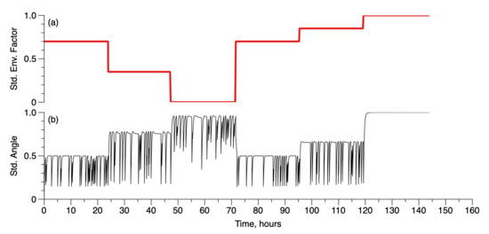 Next, after a return to the optimal value between 72 h and 96 h, the standardized environmental factors increased from 0.70 to 0.85 between 96 h and 120 h. The standardized opening angle increased consequently from 0.50 to 0.78, and the amplitude of the closing peaks increased from 0.40 degrees to ca. 0.60. Finally, when the standardized environment factors increased from 0.85 to 0.99 between 120 h and 150 h. The standardized opening angle at equilibrium increased consequently from 0.79 degrees to 1.00 degrees and the peaks amplitude decreased down to values very close to 0. All fibers were deactivated at this stage. This simulation illustrates how the steady state opening angle () can be modulated by environmental changes. The minimum value for the steady state opening angle was achieved when the values of the environmental variables are optimal. However, measured data series contain a variability that could not be explained by deterministic control, hence should be considered and quantified when comparing simulations with observations. This is particularly true when estimating parameters because uncertainties are typically calculated by optimization when fitting curves to the data; classically, the sensitivity to detect disturbances is conditioned by the requirement that the amplitude of the estimators changes is greater than these uncertainties.