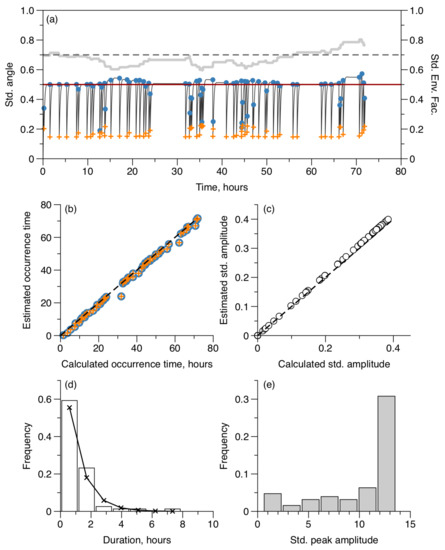 Comparison between calculated and estimated peaks, using a simulated series of valve gape variations of 72 h. (a) Environmental conditions are set to an optimal value (grey, dashed line), with a random white noise (grey solid line), and then used to simulate the dynamic of the valve gape angle (black, solid line). Starting (blue circles) and ending (orange crosses) times of peak occurrences were identified using speed and acceleration of variations. The steady-state standard angle (red solid line) was set to 0.5. (b) Cross-validation of the calculated vs. estimated peak occurrences times; the symbols and color codes are identical to (a). (c) Cross-validation of the calculated vs. estimated standardised peak amplitudes (d) Histogram of the observed distribution of the duration between two peaks; the solid line with “X” symbols is the theoretical distribution (e) Histogram of the distribution of peak amplitudes; the distribution is dependent on the occurrence sequence and does not coincide with any theoretical distribution.