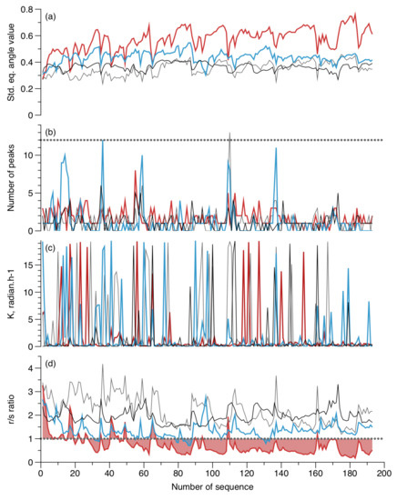 Indicators of the changes in observed valve gaping from four individual scallops as a function of the successive time-sequence definition (a sequence lasts 1 h). For all plots, individual 1 is the red line, individual 2 is the grey line, individual 3 is the blue line, and individual 4 is the black line. Panel (a) shows variations of the standardized opening angle (dimensionless) at equilibrium. Panel (b) shows the number of peaks per sequence; the dotted line is the expected maximum number of peaks under the null hypothesis. Panel (c) shows the estimated value of K per sequence of one hour. Panel (d) shows the r/s ratio per sequence of one hour. The black dotted line represents the threshold below which the deactivation rate becomes greater than the recovery rate, and the area between the curve of individual 1 and this horizontal line was filled to show the proportion of time above and below this threshold.