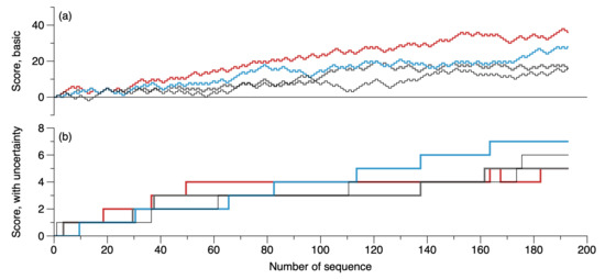 Variation of the score attributed to changes in the equilibrium angle calculated for each individual scallop in Figure 5. Individual 1 is the red line, individual 2 is the grey line, individual 3 is the blue line and individual 4 is the black line. In the upper panel (a), the score was established by a simple rule of when the equilibrium angle increased, when it decreased and 0 otherwise. In the lower panel (b), the score was weighted by the sensitivity of the estimate: changes were accounted if they were higher than the estimate variability, i.e., the discrepancy between simulations and observations.