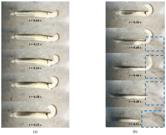 We observed the Solen strictus Gould spraying water by laying sand on the bottom of the tank. The turbidity appears on the surface of the water in the blue frame marked in Figure 2b. the Solen strictus Gould will spray water backward when the axe foot starts to swing quickly, and the water in the mantle will squeeze out further when the axe foot contracts. The fast water spray speed will speed up the movement of the Solen strictus Gould, which is another propulsion mode of the Solen strictus Gould—namely, the jet propulsion. The axe foot twists the Solen strictus Gould. At the time of muscle contraction, water flows from the inside of the shell halves outwards, but down, under the Solen strictus Gould, lifting it above the sand surface. This reduces drag when swimming.