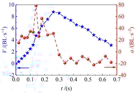 By marking red points on the frame-by-frame images, as it is shown in Figure 2a, the sprint speed and acceleration of adult Solen strictus Gould and juvenile Solen strictus Gould is shown in Figure 3 and Figure 4. The blue ‘pentagram line’ shows the velocity and the red ‘dotted line’ shows the acceleration. Furthermore, the calculated maximum speed, rushing speed, gliding speed, and acceleration time of adult Solen strictus Gould and juvenile Solen strictus Gould are shown in Table 1.