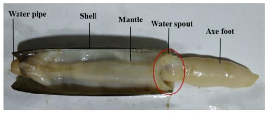 Solen strictus Gould are bivalve mollusks, so their structure is similar to bivalve mollusks. The anatomical image of Solen strictus Gould is shown in Figure 7. The gap between the axe foot and the mantle forms a water spout. The shape of the water spout is ‘V’. The Solen strictus Gould shrink or swing the axe foot and the edge of the mantle shrink according to the situation during the water spraying process to change the area of the water spout.