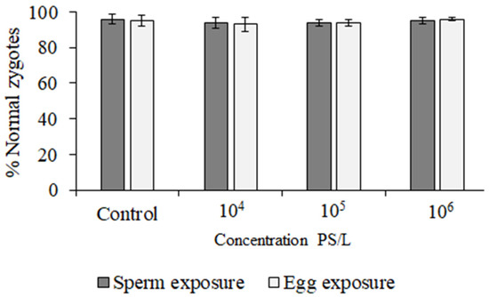 The percentage of normal zygotes formed after the exposure of gametes to water with the tested concentrations of primary microplastic was not significantly different from the control values in any of the cases (Supplementary File S1).