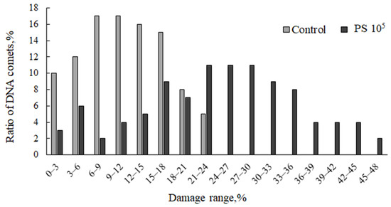 In experiments with sand dollar S. mirabilis sperm, the percent of DNA in the comet “tail” significantly increased depending on the microplastic concentration, indicating damage to the integrity of the genome in these cells. For presentation purposes, the obtained experimental data are presented in the form of a diagram characterizing the distribution of cells according to the degree of DNA damage of nuclei at intervals of 3% (Figure 4).