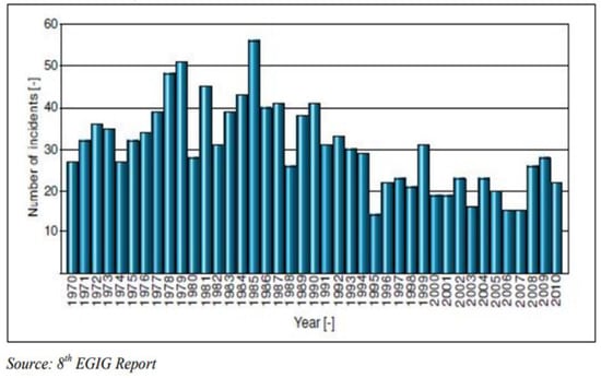Due to the examination of the Data Group of the European Gas Pipeline Incident Database, pipeline failure causes and frequencies were examined for the planned pipeline project (EGIG). The EGIG is a partnership of 15 major gas transmission networks in Europe to provide a comprehensive foundation for the safety assessment of pipeline systems so that the frequency and probability of events are better understood [34]. The 8th EGIG report showed 1249 nitrogen events between 1970 and 2010 and documented 76 nitrogen events within the past 3 years (2007–2010). Figure 2 below shows the number of pipeline failure occurrences each year from 1970 to 2010 [35].