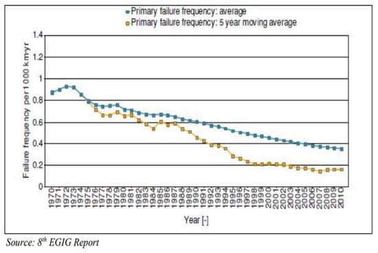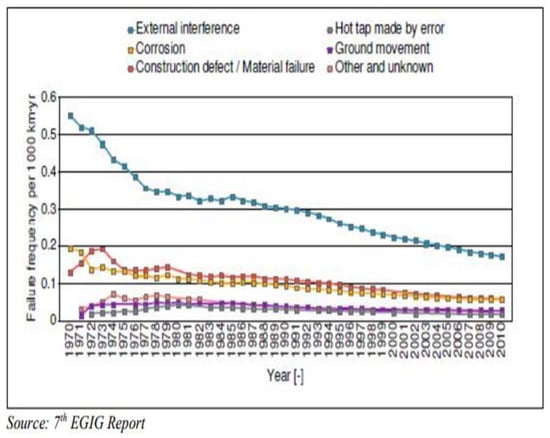 The reduction in the failure frequency of the years, mostly owing to technical improvements, is shown in Figure 5. Sweating, inspection, in-line monitoring of conditions, and enhanced damage prevention and detection methods. Regarding the source of external interference, its linked main failure frequency declined to 0.17 per 1000 km per year between 1970 and 2010, while the 5-year moving average has been reduced to roughly 0.10 per 1 thousand kilometers per year since 1997. However, the predominant cause of pipeline failure continues to be external interference to this day, with over 50% of all instances ascribed to the former throughout the period 2006–2010.