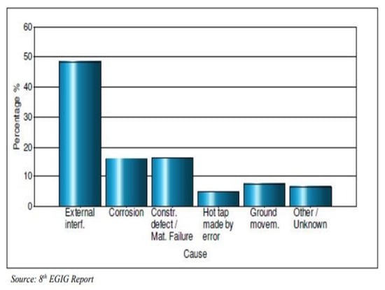 Incidents involving natural gas pipeline failures, such as external interference, building problems, internal and exterior corrosion, soil movement, and hot tap, may be linked to the following important factors as stated in previous literature. Figure 4 below shows the distribution of events with the reason [43].