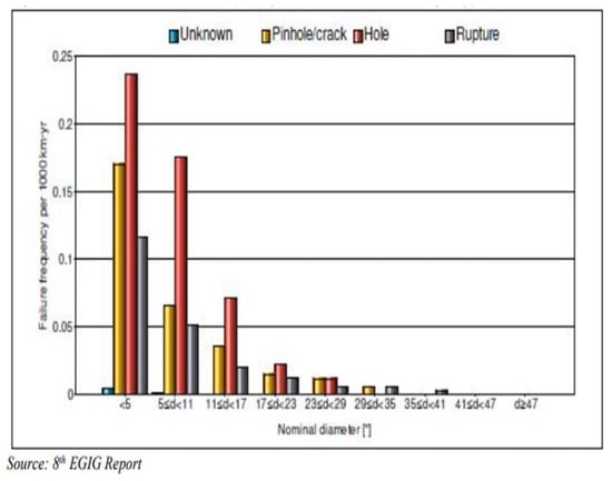 As noted above, pipeline failure potential dangers generally originate from pinhole cracks, troughs, and/or rupture induced by external disturbances, structural faults, corrosion, etc. As it has been established that an outside disturbance is one of the main reasons for pipeline incidents (EGIG database), the same has been considered when analyzing the frequency of failures regarding the type of damage and the pipeline’s diameter. Figure 6 below shows the frequency of pipeline failure in response to outside interference, damage type, and diameter class [44].