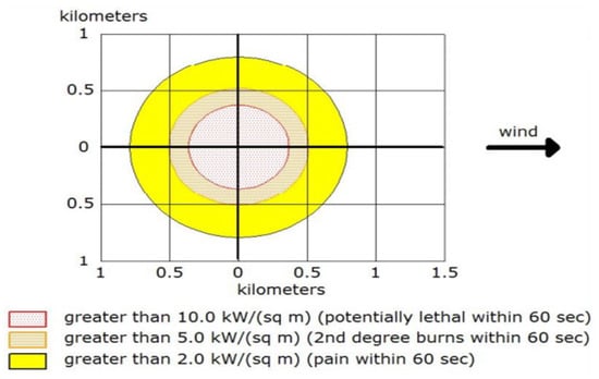In the event of leaks from the entered pipes, the transient flow from the overlying soil will be channeled via the voids. The ground will be thrown over the pipeline when the leak is significant enough [37]. The jet will cause air to travel up and scatter based on the current wind direction and other weather variables. Gas levels up to their lower flammability limit (LFL) are dangerous since they may catch fire if the ignition source is available [38]. The complete release time and impact/effect depend on the release’s speed, and the sectionalization valve separates the pipe segment. A jet fire may develop when the substance finds an igniting source within its flammable range. The velocity of the material emitted from the pipeline usually leads to vertically directed flames. Such flames are less hazardous than horizontal flames [39].