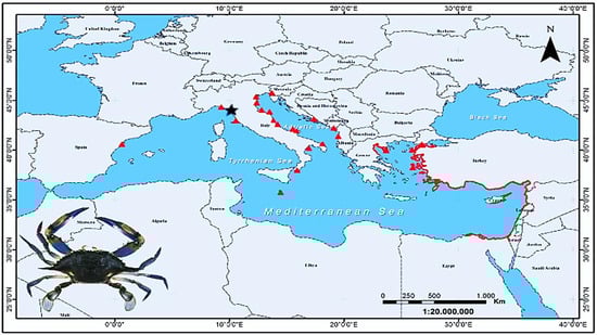 Map of the Mediterranean Sea showing the distribution of the blue crabs (Callinectes sapidus) by red dots [7].