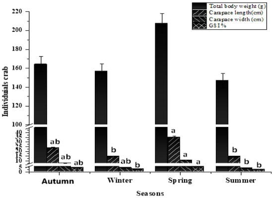 The average carapace width was 126 ± 18.80 mm, while the highest value was 179 ± 9.71 mm and the lowest was 82 ± 5.17 mm. The carapace length showed an average of 59 ± 7.12 mm, while the maximum carapace length was 79 ± 3.04 mm. Moreover, the weight of 100 males C. sapidus showed an average value at 145.9 ± 5.98 g., while the highest value was 329.3 ± 11.52 g. The lowest value was 48.9 ± 2.93 g. The morphological examination of the reproductive system taken through the different seasons of the year appears in accordance with the morphometrical study of the size, length, and width of the cephalothorax. The values of GSI varied from 2.65 to 5.56% for males of total body weight ranging from 147.02 to 207.6 g, carapace length with two peaks at 14.24–34.83 cm with significant differences during the seasons in Abu-Qir 2019 (Figure 2). The best values of total body weight (g), Length, Width (cm), and GSI % in males of C. sapidus in the Spring season without significant differences in Autumn, and the lowest values were in Summer with a significant difference.