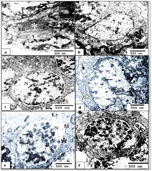 Transmission electron micrograph of Callinectes sp. testis showing (a). basal part of seminiferous tubule with myoid cell, nucleus (N), nuclear pores (dashed arrows), the cellular junction (arrows), contracted fibers (star), endoplasmic reticulum (ER), and basement membrane (BM). Spermatogonia rest on the basement membrane (BM) with nucleus (N) contains dispersed euchromatin, many dense mitochondria (M), and rough endoplasmic reticulum (rER) (b). Preleptotene stage with nucleus (N), small chromosome (arrow), double nuclear envelope (dashed arrow), few mitochondria (M), and small vesicular endoplasmic reticulum (ER) (c). Leptotene stage with nucleus (N), clear thread- chromosomes (arrow), centriole (dashed-arrow), vesicular rough endoplasmic reticulum (rER), and annulated lamellae (dashed arrow) (d). Zygotene stage with nucleus (N) has intertwined thick chromosomes, paired cords (black arrows), poor mitochondria (M), vesicular rough endoplasmic reticulum (star), nuage (white arrow), secondary lysosome (Ly2) (e). The Pachytene stage has a nucleus (N), chromosomes have synaptonemal complexes (arrows), poor small mitochondrion (M), free ribosomes (R), and myelin body (star) (f).