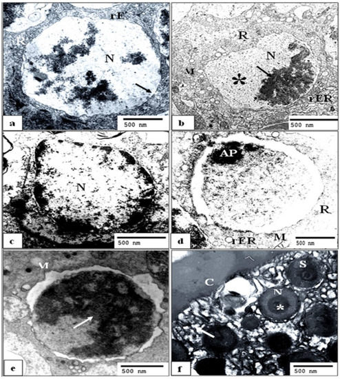 The zygotene spermatocytes were of the same size as the leptotene. They are discernible from leptotene spermatocytes by the existence of denser and “long cord-like chromosome” blocks in the oval nucleus. A slightly prominent and electron-dense nucleolus-like body or nuage was noticed at the cytoplasm (Figure 4e). The Pachytene stage showed paired chromosomes with synaptonemal complexes inside the nucleus and many mitochondria in its cytoplasm (Figure 4f).