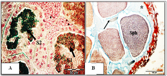 A photomicrograph of a transverse section of the testes of Callinectes sapidus showing evacuated duct with sperm and Secretion 1 (S1) (red color) and secretion 2 (S2) with (green color) (Masson trichrome stain) (A). A photomicrograph of a transverse section of the distal part of anterior vas deference Notice; spermatophore (Sph) with S5 (Star) and S6 secretions (black arrow) (Mallory triple Stain) (B).