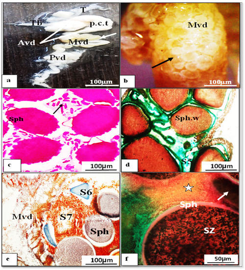 Photograph of the isolated right side of an early mature male genital system showing: testes (T), anterior vas deferens (AVD), posterior coiled mass (p.c.t), middle vas deferens (MVD), posterior vas deferens (PVD), transverse bridge (Tb), V- shape (arrow) (a). Stereoscopical picture of the middle vas deferens (MVD) showing: spermatophores (black arrow) (b). Photomicrograph of a transverse section of the middle vas deferens showing: spermatophore (Sph) and rod-shaped secretion 6 (black arrow) (PAS) (c). Photomicrograph of a transverse section of middle vas deferens showing: spermatophore (Sph) with S5 and S6 secretions (Mallory’s triple stain) (d). Photomicrograph of a transverse section of middle vas deferens showing: spermatophore (Sph), rod-shaped secretion S6, and granular secretions S7 (Mallory’s triple stain) (e). Photomicrograph of a transverse section of middle vas deferens showing: mature spermatophore (Sph), rod-shaped S6 secretion, and granules shape S7 secretions (Masson’s trichrome) (f).