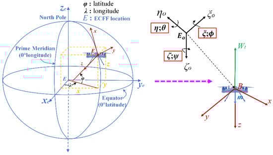 The centroid of the quadrotor is set as the origin of the body coordinate system, and the body coordinate frame (system frame, B) and the geodetic coordinate frame (E) are built. It is assumed that the attitude vector of the quadrotor in the navigation coordinate system is used for the conversion from the system coordinate system to the inertial coordinate system. For the convenience, represents the cosine function and represents the sine function. The position and the attitude of the quadrotor can be described by . The body coordinate system of the quadrotor is set as the starting coordinate system.