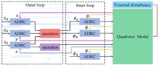The dynamic landing of the quadrotor on the moving surface float of the wave glider at sea should located by using the April Tag visual reference system. To ensure the stability and accuracy of landing, the control system of quadrotor needs both position control and attitude control. According to Equation (10), the quadrotor is a second-order nonlinear system with 6 degrees of freedom and 4 control inputs, whereas it is difficult for general controllers to estimate the unknown disturbance of the nonlinear system. However, an ADRC can effectively solve the mentioned problem, and the series ADRC model of the quadrotor is designed, which is shown in Figure 2.