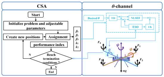 Under the MATLAB/Simulink environment, the quadrotor model with the ICADRC is introduced. Figure 3 illustrates the schematic diagram of the improved CSA with optimized θ-channel active disturbance rejection controller. The performance of the proposed ICADRC and landing control on the surface boat of the wave glider are evaluated and verified.