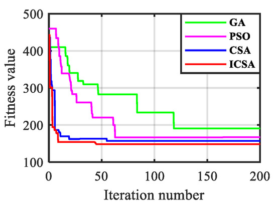 The control experiments are performed with the GA, the PSO, the CSA and improved CSA algorithm (ICSA) with dimension 5, population size 100 and iteration number 50. The results of iterations of fitness values of the four optimization algorithms are shown in Figure 4. As indicated from the figure, after 200 iterations, all four algorithms will converge to their respective optimal values. Among these algorithms, the ICSA algorithm converges relatively fast, and the results after 5 iterations are significantly better than those of the GA and the PSO after 50 iterations. It is shown that the CSA has better performance than conventional search algorithms when finding the optimal solution, and it can improve the search capability after adopting the adaptive step.
