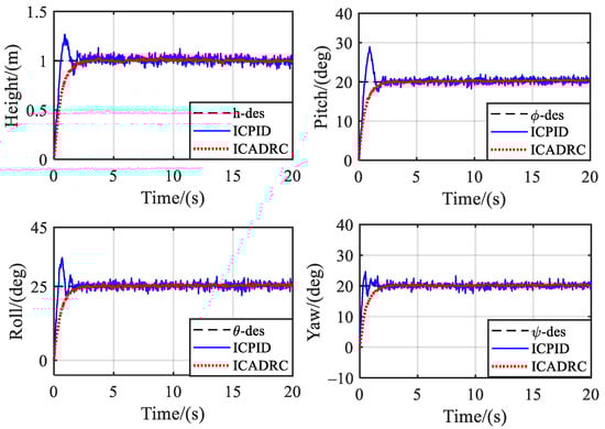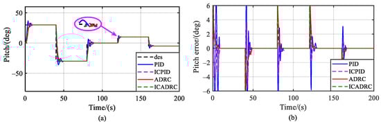 The PID controller, the ICPID controller, the ADRC controller, and the ICADRC controller are used to track and control the same input signals under the identical quadrotor dynamic model, respectively. As shown in Figure 5, a rectangular wave signal with variable amplitude is used as the control command of the desired pitch angle, and the control effects of the PID controller and the ADRC control are similar when the pitch angle remains unchanged. When the desired angle changes suddenly, the angle tracking errors of the ADRC and the ICADRC are small and do not show large overshoot and oscillation, while the angle tracking errors of the PID controller and the ICPID controller show larger overshoot and oscillation. However, the ICPID controller can suppress overshoot and oscillation to some extent.