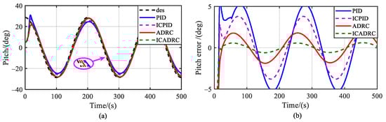 Pitch angle tracking control under sinusoidal signal without external interference. (a) The tracking control effects of several controllers under the same sinusoidal signal; and (b) tracking errors of several controllers.