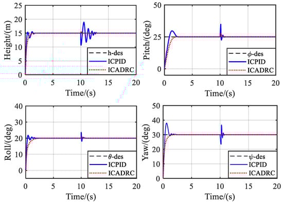The responses of the quadrotor without disturbance under different controllers are shown in Figure 7. It can be seen from the simulation results that both the ICPID controller and the ICADRC are capable of maintaining the desired height without disturbance, whereas the ICADRC can track the desired signal smoothly. The ICPID controller has more significant oscillations and longer recovery time after external disturbance, while the ICADRC has smaller disturbance and can recover more efficiently.