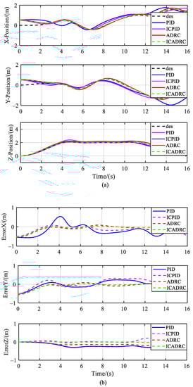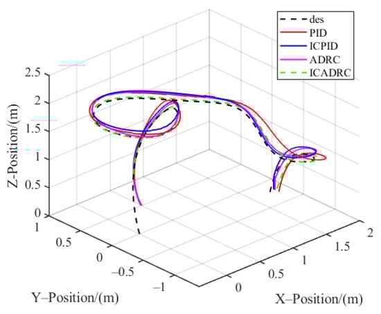 The desired trajectory tracking capability of the quadrotor is simulated with the same dynamic model with different controllers. The starting point of the desired trajectory is set to [0, 0, 0], the starting point of the quadrotor is set to [0.5, 0.5, 0], and the simulation time is set to 16 s. The PID controller, the ICPID controller, the ADRC controller, and the ICADRC controller are employed to track and control the identical desired trajectory, and the space trajectories of the quadrotor under different controllers are illustrated in Figure 9. The position trajectory tracking and trajectory tracking errors of the quadrotor under different controllers are shown in Figure 10, which indicate that the ADRC and the ICADRC track better, respond faster and have less overshoot compared with the ICPID and the PID controllers under the same conditions. The control effect of the ICADRC can be improved over conventional ADRC controller. The trajectory tracking errors of the ADRC and the ICADRC are among [−0.2 m, 0.2 m], while the trajectory tracking errors of the PID and the ICPID are relatively large. According to four controllers, the ICADRC controller exhibits the optimal position control capability, which is more consistent with the practical engineering requirements.