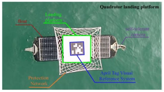 The “Black Pearl” wave glider as a platform for quadrotor landing is used in the sea trial as shown in Figure 11. A protective net around the landing platform is adopted to prevent the quadrotor from crashing into the sea when landing failure. The porous pearl cotton and the matte finish of the April Tag visual reference system are used to minimize the impact of sunlight reflection on the quadrotor landing. High friction rubber pads installed on the bottom of the quadrotor can increase the frictional resistance between the quadrotor and the landing platform and prevent the quadrotor from sliding attributed to the shanking of the surface float. During the experiment, GPS positioning and WiFi communication are used to guide the quadrotor to fly around the wave glider, and the April Tag visual reference system is used to guide the quadrotor for further landing. The landing speed and the attitude of the quadrotor during the landing are used as indicators of the superior performance of the controller.