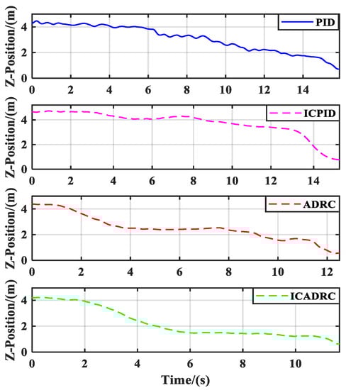 The shortest landing time of the quadrotor under different controllers acts as an indicator for comparative analysis. The position changes of the quadrotor during landing are shown in Figure 12. Compared with the PID controller, the altitude change of the quadrotor under the ADRC controller is smoother and shorter, which demonstrates that the ADRC can effectively suppress the influence of external disturbances. After the ADRC controller parameters optimized by the ICSA, the external disturbances can be further suppressed, and the altitude change of the quadrotor is smoother and the landing time can be further shortened.