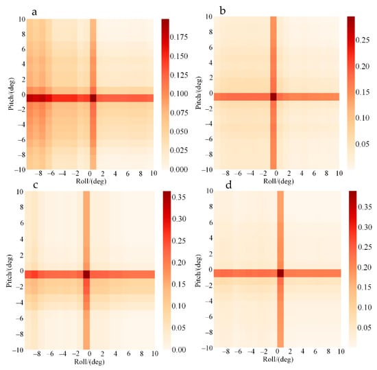 The attitude heat maps of the quadrotor. (a) Under the PID controller; (b) under the ICPID controller; (c) under the ADRC controller; and (d) under the ICADRC controller.