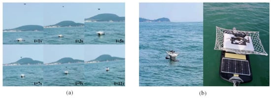 Sea trials. (a) Dynamic landing of quadrotor on the sea; and (b) equipment recycling picture.