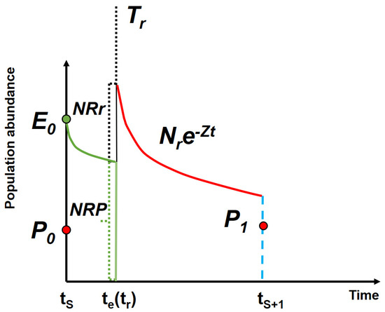 Generally, the spawning season of P. penicillatus is between April and May in Xiamen Bay. To facilitate calculation and setting conditions, we assume that all spawning will be completed on 1 May (ts: time of spawning). The release time is generally 15 June. This time is usually around the international ocean week (8 June). Therefore, we assume that P is the number of spawning shrimps in the natural sea area, te is the annual release time of juvenile shrimp (te: release time of stock replenishment), tr and NR are the recruitment time and the number of recruitments for juvenile shrimp to enter the fisheries, respectively. At this time, there are two sources of recruitments NR; one is from spawning brood stock NRP and the other is from released juvenile shrimp NRr. The schematic diagram of assessment model is shown in Figure 2.