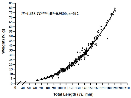 The weight–length equations obtained were as follows (Figure 4):