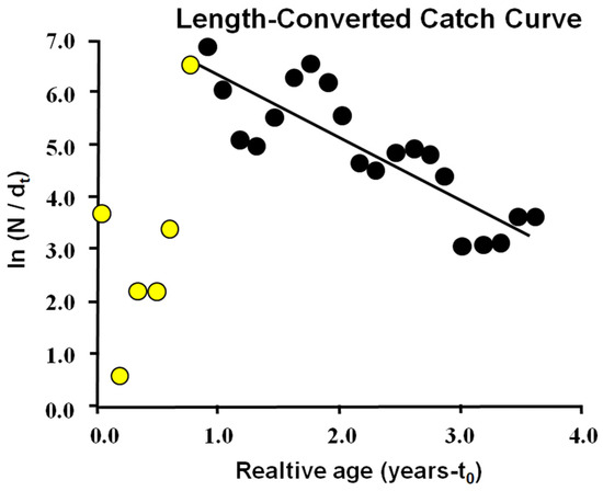 The instantaneous rate of total mortality (Z) was found from the estimate of the growth parameters (K, L∞), using the length-converted catch curve method (FiSAT II software) [31]. The instantaneous rates of fishing mortality (F) were calculated by the subtraction of the estimates of M from Z, as follows: