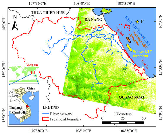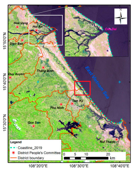 Coastal areas in Vietnam are among the most densely populated regions in the world [12]. In addition, the country’s leading economy is principally located in coastal and estuarine areas [13]. In recent years, the coastlines in the central of Vietnam and Quang Nam province have been severely eroded [14]. Nevertheless, the coastline’s retreating trend predominantly influences a potential threat to Quang Nam province’s local income, subsistence, and socio-economic development [15]. Moreover, Quang Nam province is affected by a tropical climate with high temperature and evaporation. The natural and hydro-meteorological conditions result in 3–5 tropical cyclones and depression storms each year, causing intense rainfall and subsequent floods on the central coast [16]. The endogenous, exogenous, and human-induced factors are also factors leading to coastline change [17]. Thus, spatio-temporal analysis of coastline change in Quang Nam is crucially important.