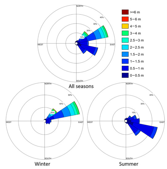 Re-analysis wave characteristics at point P on Figure 1 from the WAVEWATCHII data sets (source: https://polar.ncep.noaa.gov/waves/hindcasts/nopp-phase2.php, accessed on 11 April 2021) for all seasons, Winter, and Summer.